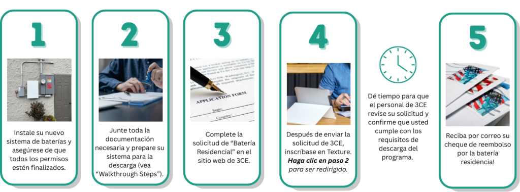 - After application is submitted, customer will click “Step 2” to complete the battery registration with Texture. Rebate will not be issued until 3CE has verified the battery system is meeting 50% daily discharge requirement between 4 PM and 9 PM PT.
